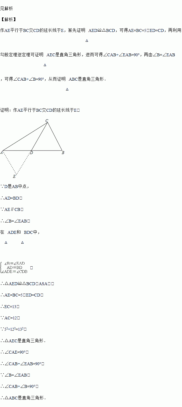 如图,在△ABC中,D是AB的中点,若AC=12,BC=5,CD=6.5.求证:△ABC是直角三角形.