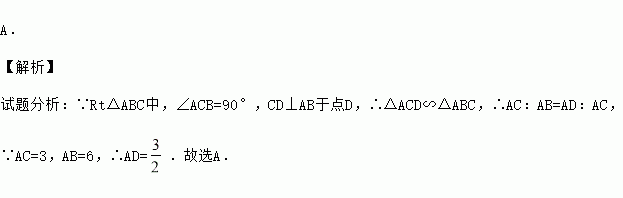 如图,在Rt△ABC中,∠ACB=90°,CD⊥AB于点D,如果AC=3, AB=6,那么AD的值为( )