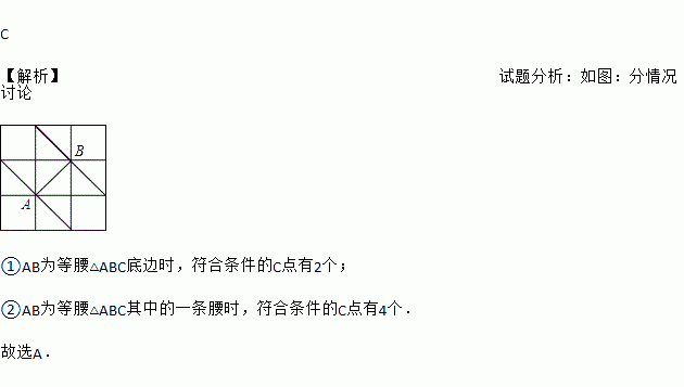 如图所示的正方形网格中,网格线的交点称为格点.已知A、B是两格点,如果C也是图中的格点,且使得△ABC为等腰三角形,则点C的个数是( )