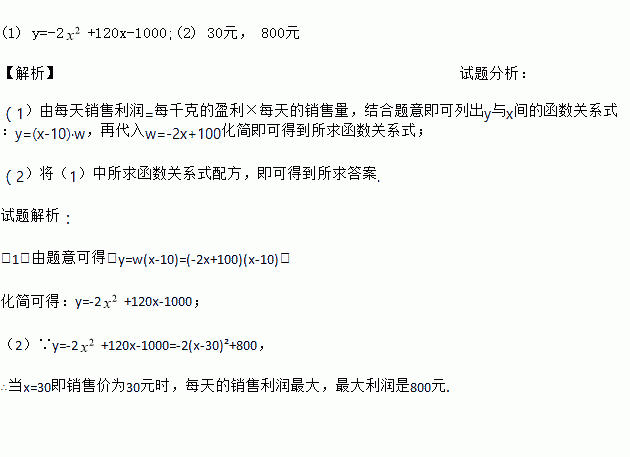 (1) y=-2+120x-1000;(2) 30元, 800元 【解析】试题分析: (1)由每天销售利润=每千克的盈利×每天的销售量,结合题意即可列出y与x间的函数关系式:y=(x-10)·w,再代入w=-2x+100化简即可得到所求函数关系式; (2)将(1)中所求函数关系式配方,即可得到所求答案. 试题解析: (1)由题意可得:y=w(x-10)=(-2x+10...