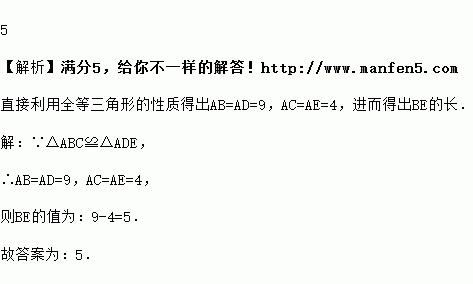 如图,已知△ABC≌△ADE,若AB=9,AC=4,则BE的值为____.
