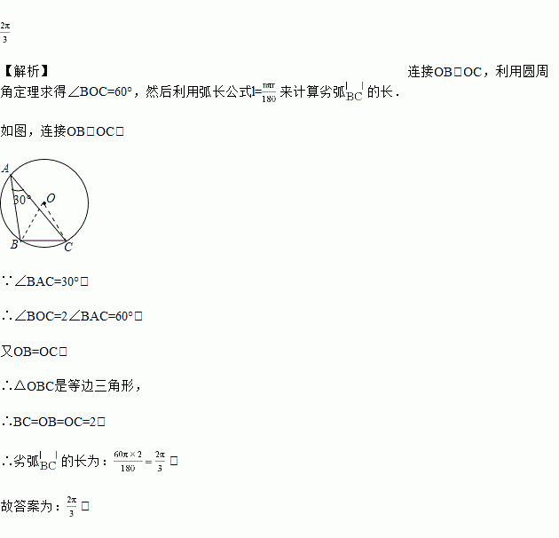 如图,⊙O是△ABC的外接圆,BC=2,∠BAC=30°,则劣弧的长为_____(保留π)