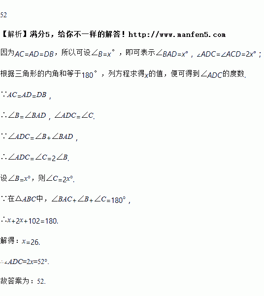 如图,△ABC中,D是BC上一点,AC=AD=DB,∠BAC=102°,则∠ADC=________度.