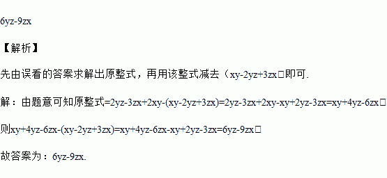 有一个整式减去(xy-2yz+3zx)的题目,小林误看成加法,得到的答案是2yz-3zx+2xy,那么原题正确的答案是_______