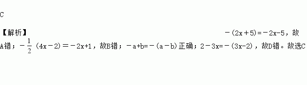 C 【解析】-(2x+5)=-2x-5,故A错;-(4x-2)=-2x+1,故B错;-a+b=-(a-b)正确;2-3x=-(3x-2),故D错。故选C