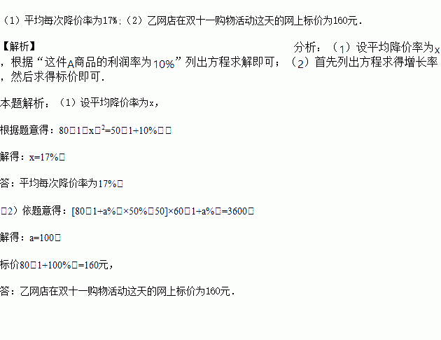 (1)“双十一”购物活动当天,甲网店连续两次降价销售A商品吸引买主,问平均每次降价率为多少,才能使这件A商品的利润率为10%?(参考数据: