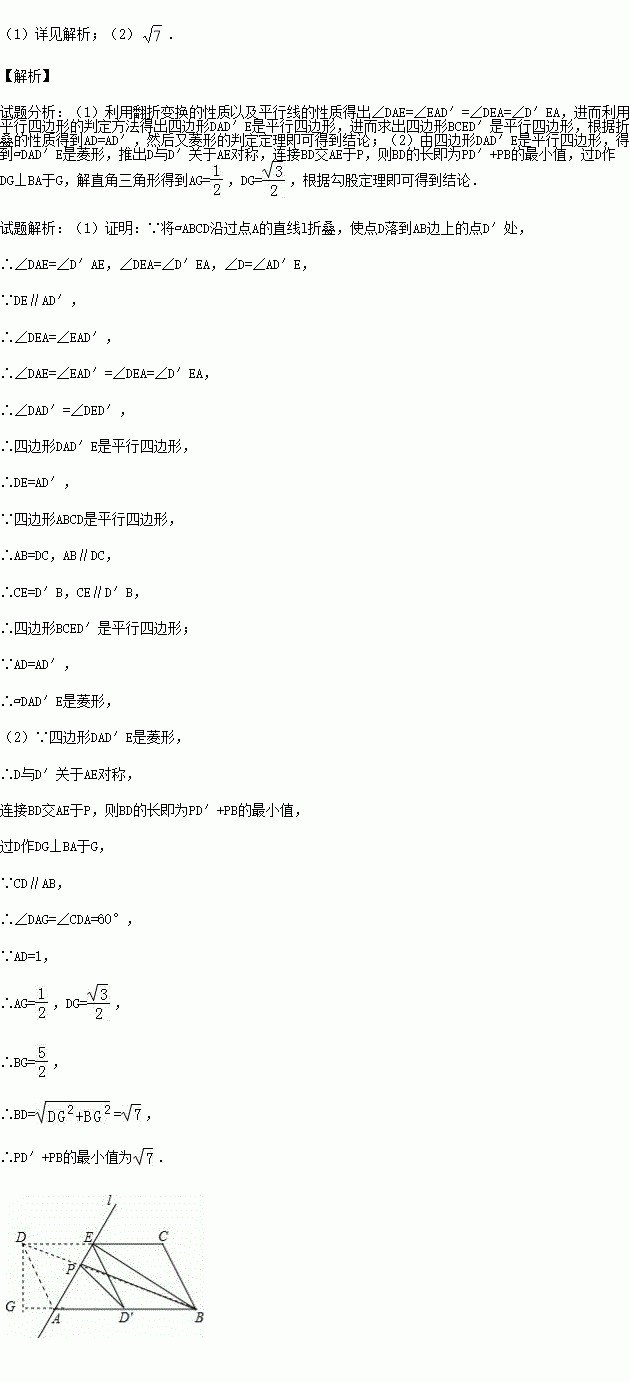 如图,?ABCD中,AB=2,AD=1,∠ADC=60°,将?ABCD沿过点A的直线l折叠,使点D落到AB边上的点D′处,折痕交CD边于点E.