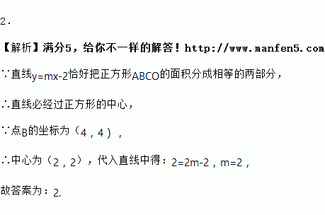 如图,在平面直角坐标系中,四边形ABCO是正方形,点B的坐标为(4,4),直线y=mx-2恰好把正方形ABCO的面积分成相等的两部分,则m=________.