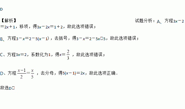 A. 方程3x-2=2x+1,移项,得3x-2x=-1+2