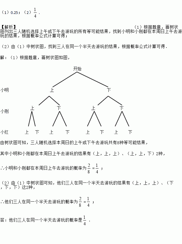 (1)0.25;(2). 【解析】(1)根据题意,画树状图列出三人随机选择上午或下午去游玩的所有等可能结果,找到小明和小刚都在本周日上午去游玩的结果,根据概率公式计算可得; (2)由(1)中树状图,找到三人在同一个半天去游玩的结果,根据概率公式计算可得. 【解析】 (1)根据题意,画树状图如图, 由树状图可知,三人随机选择本周日的上午或下午去游玩共有8种等可能结果, ...