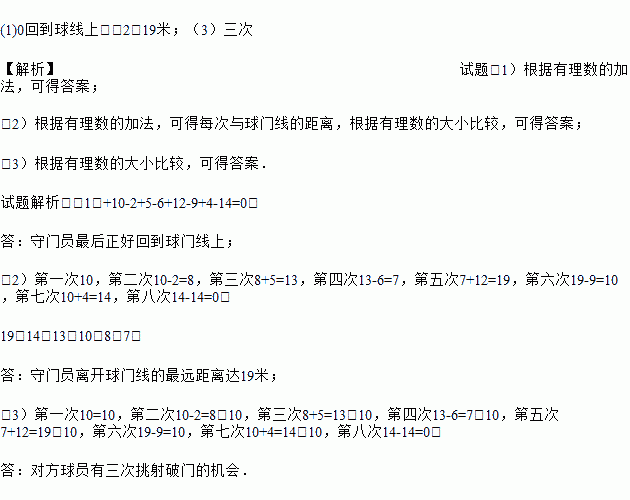 世界杯比赛中,根据场上攻守形势,守门员会在门前来回跑动,如果以球门线为基准,向前跑记作正数,返回则记作负数,一段时间内,某守门员的跑动情况记录如下(单位:m):+10,﹣2,+5,﹣6,+12,﹣9,+4,﹣14.(假定开始计时时,守门员正好在球门线上)