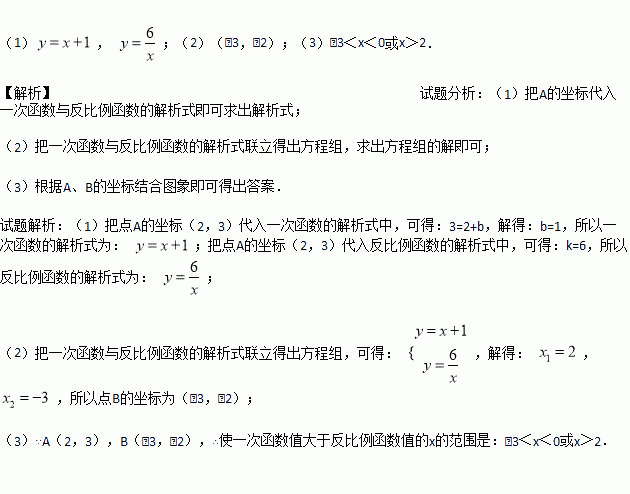 如图,已知一次函数y=x+b与反比例函数y= 的图象交于A、B两点,其中点A的坐标为(2,3).(1)求点B的坐标;(2)请根据图象直接写出不等式x+b>的解集.