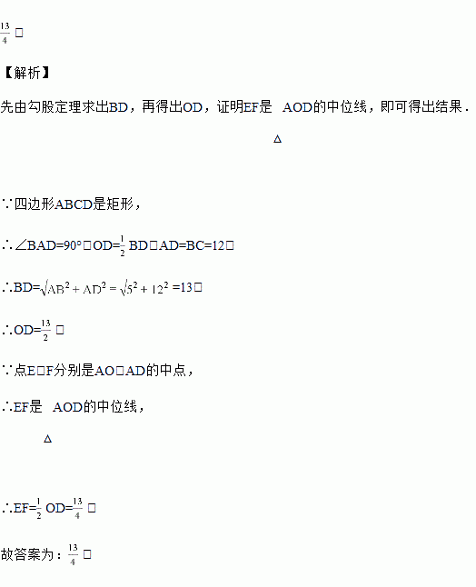 如图,在矩形ABCD中,对角线AC、BD相交于点O,点E、F分别是AO、AD的中点,若AB=5cm,BC=12cm,则EF=_____ cm.