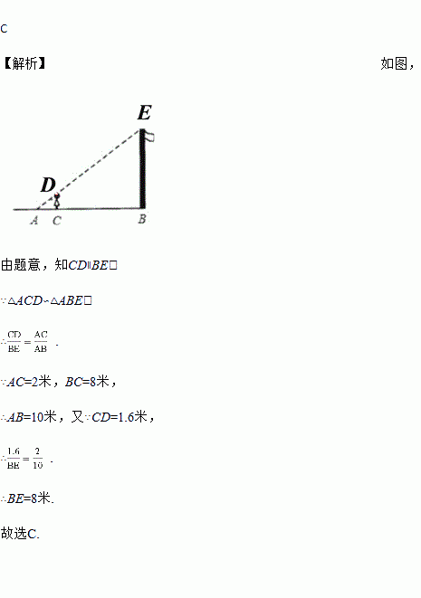 如图,身高1.6米的学生小李想测量学校的旗杆的高度,当他站在C处时,他头顶端的影子正好与旗杆顶端的影子重合,并测得AC=2米,BC=8米,则旗杆的高度是( )