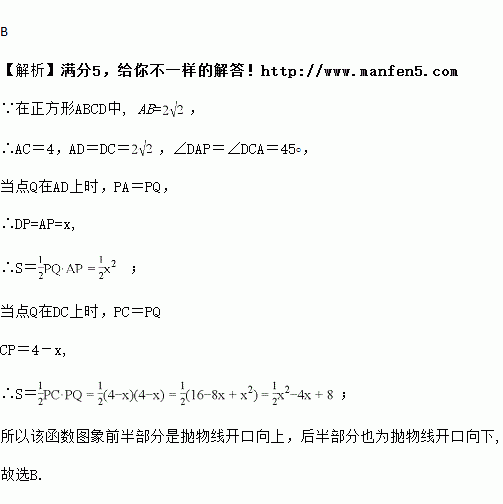 如图,在正方形ABCD中,AB=,P为对角线AC上的动点,PQ⊥AC交折线A﹣D﹣C于点Q,设AP=x,△APQ的面积为y,则y与x的函数图象正确的是( )