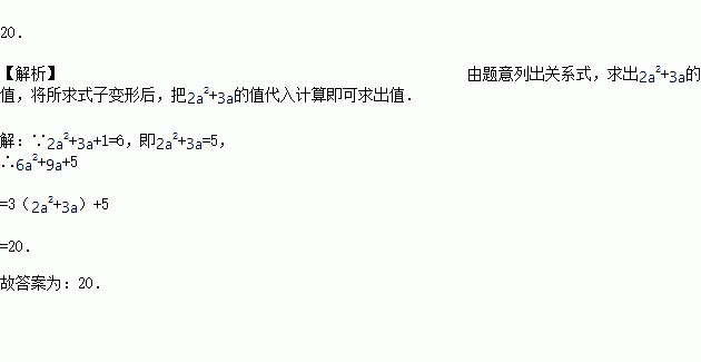 若代数式2a2+3a+1的值为6,则代数式6a2+9a+5的值为__________.