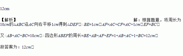 如图,将△ABC沿AC方向平移1cm得到△DEF,若△ABC的周长为10cm.则四边形ABEF的周长为_____.