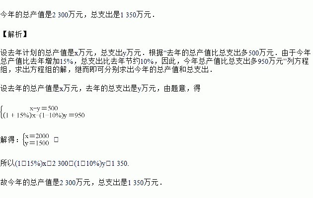 某工厂去年的总产值比总支出多500万元.由于今年总产值比去年增加15%,总支出比去年节约10%,因此,今年总产值比支出多950万元.今年的总产值和总支出各是多少万元?