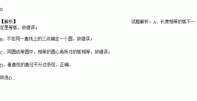 C. 相等的圆心角所对的弧相等; D. 垂直弦的直径平分这条弦.
