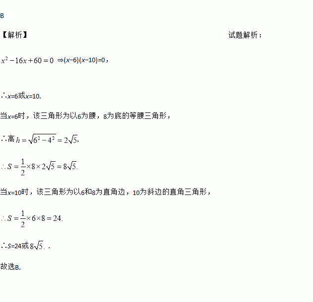 三角形两边的长分别是8和6,第三边的长是一元二次方程x2﹣16x+60=0的一个实数根,则该三角形的面积是( )