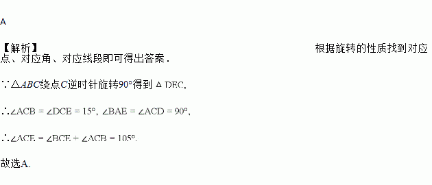 如图,在△ABC中,∠ACB=15°,△ABC绕点C逆时针旋转90°后与△DEC重合,则∠ACE的读数是( )