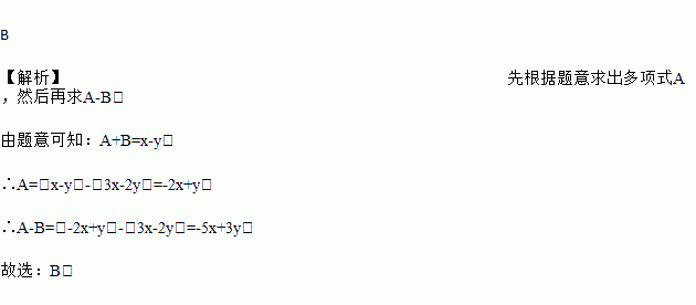 某同学做了一道数学题:“已知两个多项式为A,B,B=3x﹣2y,求A﹣B的值.”他误将“A﹣B”看成了“A+B”,结果求出的答案是x﹣y,那么原来的A﹣B的值应该是( )