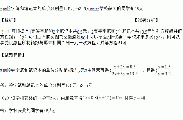 为弘扬中华民族传统文化,某校举办了“古诗文大赛”,并为获奖同学购买签字笔和笔记本作为奖品.1支签字笔和2个笔记本共8.5元,2支签字笔和3个笔记本共13.5元.