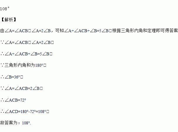 如图,点D为BC延长线上的一点,∠A=∠ACB,∠A=2∠B,则∠ACD的度数为____.