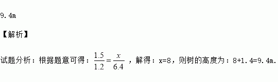 9.4m 【解析】 试题分析:根据题意可得:,解得:x=8,则树的高度为:8+1.4=9.4m.