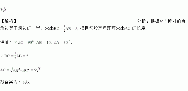 在△ABC中,∠C=90o,AB=10,∠A=30o,AC= ____