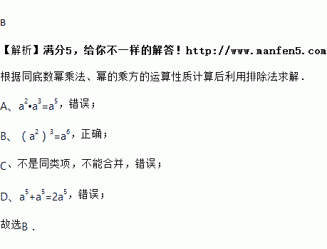 A. a2•a3=a6 B. (a2)3=a6 C. a6﹣a2=a4 D. a5+a5=a10