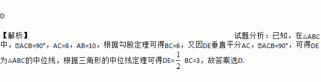 如图,在△ABC中,∠ACB=90°,AC=8,AB="10." DE垂直平分AC交AB于点E,则DE的长为( )
