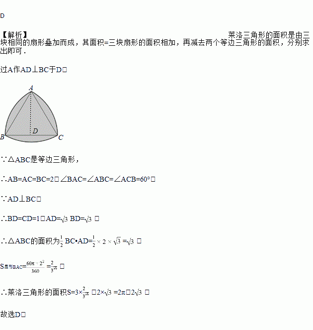 如图,分别以等边三角形ABC的三个顶点为圆心,以边长为半径画弧,得到的封闭图形是莱洛三角形,若AB=2,则莱洛三角形的面积(即阴影部分面积)为( )