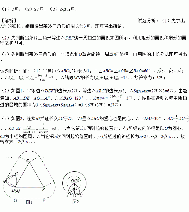 (2)如图3,将这个图形的顶点A与等边△DEF的顶点D重合,且AB⊥DE,DE=2π,将它沿等边△DEF的边作无滑动的滚动当它第一次回到起始位置时,求这个图形在运动过程中所扫过的区域的面积;