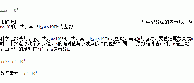 2017年5月5日,国产大型客机C919首飞成功圆了中国人的“大飞机梦”,它颜值高性能好,全长近39米,最大载客人数168人,最大航程约5550公里,数字5550用科学记数法表示为____________.