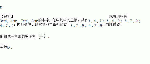 现有四根长3 cm、4 cm、7 cm、9 cm的木棒,任取其中的三根,首尾相连后,能组成三角形的概率为( )