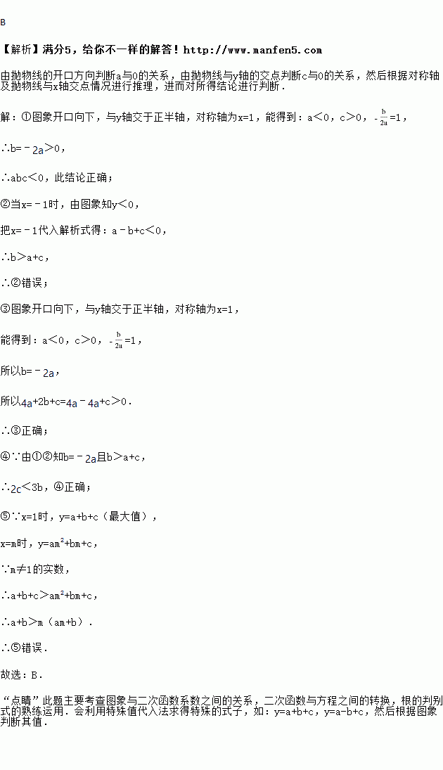 ①abc<0; ②b<a+c; ③4a+2b+c>0;④2c<3b;⑤a+b<m (am+b)(m≠1的实数),其中结论正确的个数有( )
