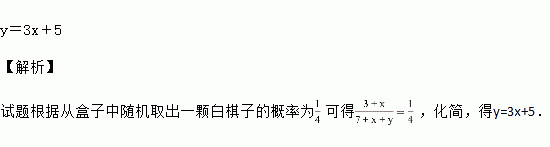 已知一个围棋盒子中装有7颗围棋子,其中3颗白棋子,4颗黑棋子.若往盒子中再放入x颗白棋子和y颗黑棋子,从盒子中随机取出一颗白棋子的概率为,则y与x之间的关系式是_________.