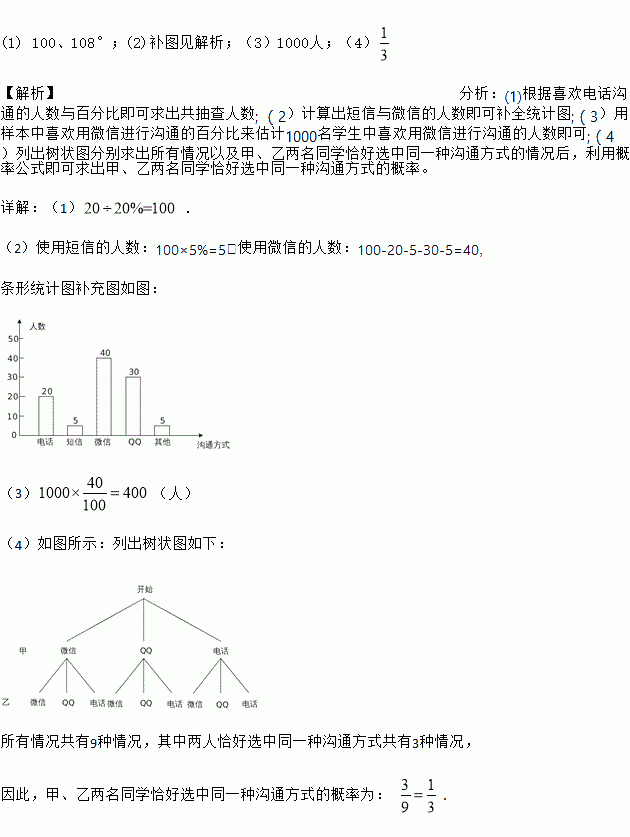 (4)某天甲、乙两名同学都想从“微信”、“QQ”、“电话”三种沟通方式中选一种方式与对方联系,请用列表或画树状图的方法求出甲、乙两名同学恰好选择同一种沟通方式的概率.