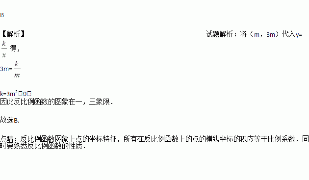 B 【解析】试题解析:将(m,3m)代入y=得, 3m= k=3m2>0, 因此反比例函数的图象在一,三象限. 故选B. 点睛:反比例函数图象上点的坐标特征,所有在反比例函数上的点的横纵坐标的积应等于比例系数,同时要熟悉反比例函数的性质.在△ABC中,若tanA=1,sinB=