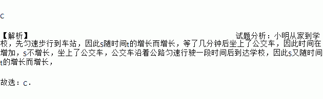 小明从家到学校,先匀速步行到车站,等了几分钟后坐上了公交车,公交车沿着公路匀速行驶一段时间后到达学校,小明从家到学校行驶路程s(m)与时间t(min)的大致图象是(  )