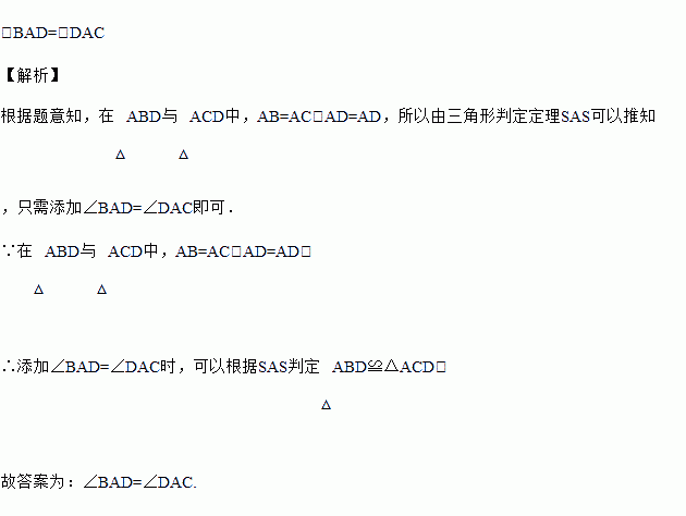 如图,AB=AC,若要判定△ABD≌△ACD,则需要添加的一个条件是:________