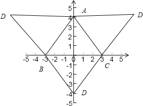 10.现以A(0,4),B(-3,0),C(3,0)三点为顶点画平行四边形,则第四个顶点D的坐标为(6,4)(-6,4),(0,-4).分析 首先画出坐标系,再分别以AB、AC、BC为对角线作出平行四边形,进而可得D点坐标.