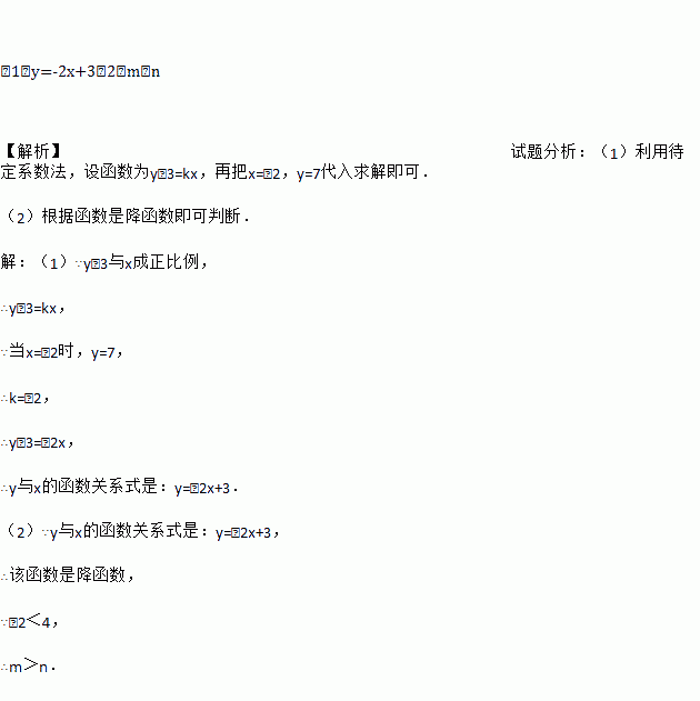 (1)y=-2x+3(2)m>n 【解析】试题分析:(1)利用待定系数法,设函数为y﹣3=kx,再把x=﹣2,y=7代入求解即可. (2)根据函数是降函数即可判断. 【解析】 (1)∵y﹣3与x成正比例, ∴y﹣3=kx, ∵当x=﹣2时,y=7, ∴k=﹣2, ∴y﹣3=﹣2x, ∴y与x的函数关系式是:y=﹣2x+3. (2)∵y与x的函...