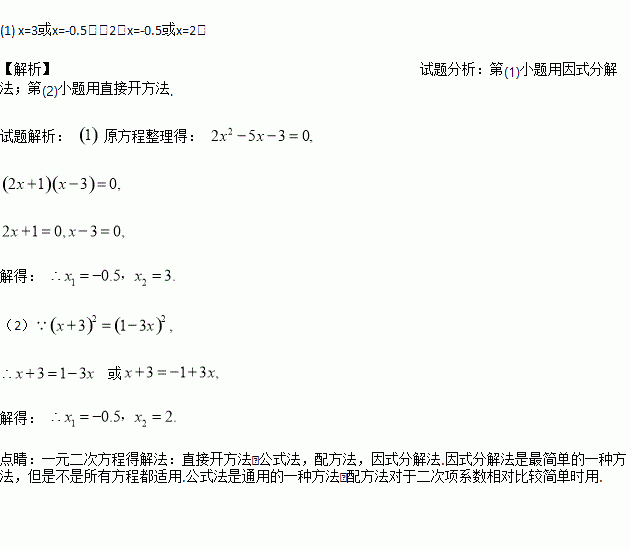 解下列方程:(1)2x2-5x=3;(2)(x+3)2=(1-3x)2.