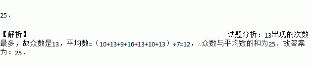 25. 【解析】试题分析:13出现的次数最多,故众数是13,平均数=(10+13+9+16+13+10+13)÷7=12,∴众数与平均数的和为25.故答案为:25.