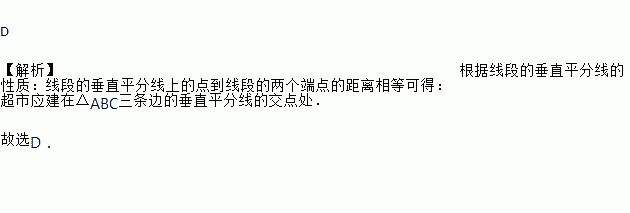 Èçͼ£¬ÓÐA¡¢B¡¢CÈý¸ö¾ÓÃñÐ¡ÇøµÄλÖóÉÈý½ÇÐΣ¬ÏÖ¾ö¶¨ÔÚÈý¸öÐ¡ÇøÖ®¼äÐÞ½¨Ò»¸ö¹ºÎﳬÊУ¬Ê¹³¬Êе½Èý¸öÐ¡ÇøµÄ¾àÀëÏàµÈ£¬Ôò³¬ÊÐÓ¦½¨ÔÚ( )