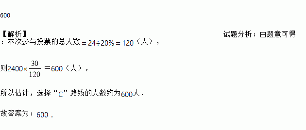 某校在“祖国好、家乡美”主题宣传周里推出五条A、B、C、D、E旅游线路.某校摄影社团随机抽取部分学生举行“最爱旅游路线”投票活动,参与者每人选出一条心中最爱的旅游路线,社团对投票进行了统计,并绘制出如下不完整的条形统计图和扇形统计图.全校2400名学生中,请你估计,选择“C”路线的人数约为________.