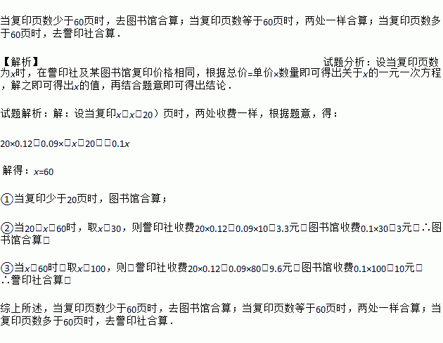 当复印页数少于60页时,去图书馆合算;当复印页数等于60页时,两处一样合算;当复印页数多于60页时,去誊印社合算. 【解析】试题分析:设当复印页数为x时,在誊印社及某图书馆复印价格相同,根据总价=单价×数量即可得出关于x的一元一次方程,解之即可得出x的值,再结合题意即可得出结论. 试题解析:【解析】 设当复印x(x>20)页时,两处收费一样,根据题意,得: 20×0.12+0....