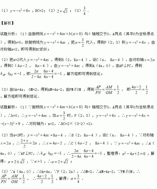 轴相交于O、A两点(其中O为坐标原点),过点P(2,2a)作直线PM⊥x轴于点M,交抛物线于点B,点B关于抛物线对称轴的对称点为C(其中B、C不重合),连接AP交y轴于点N,连接BC和PC.